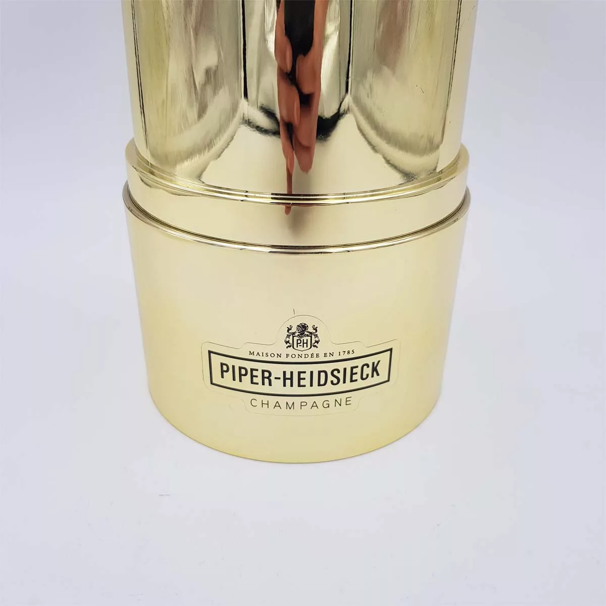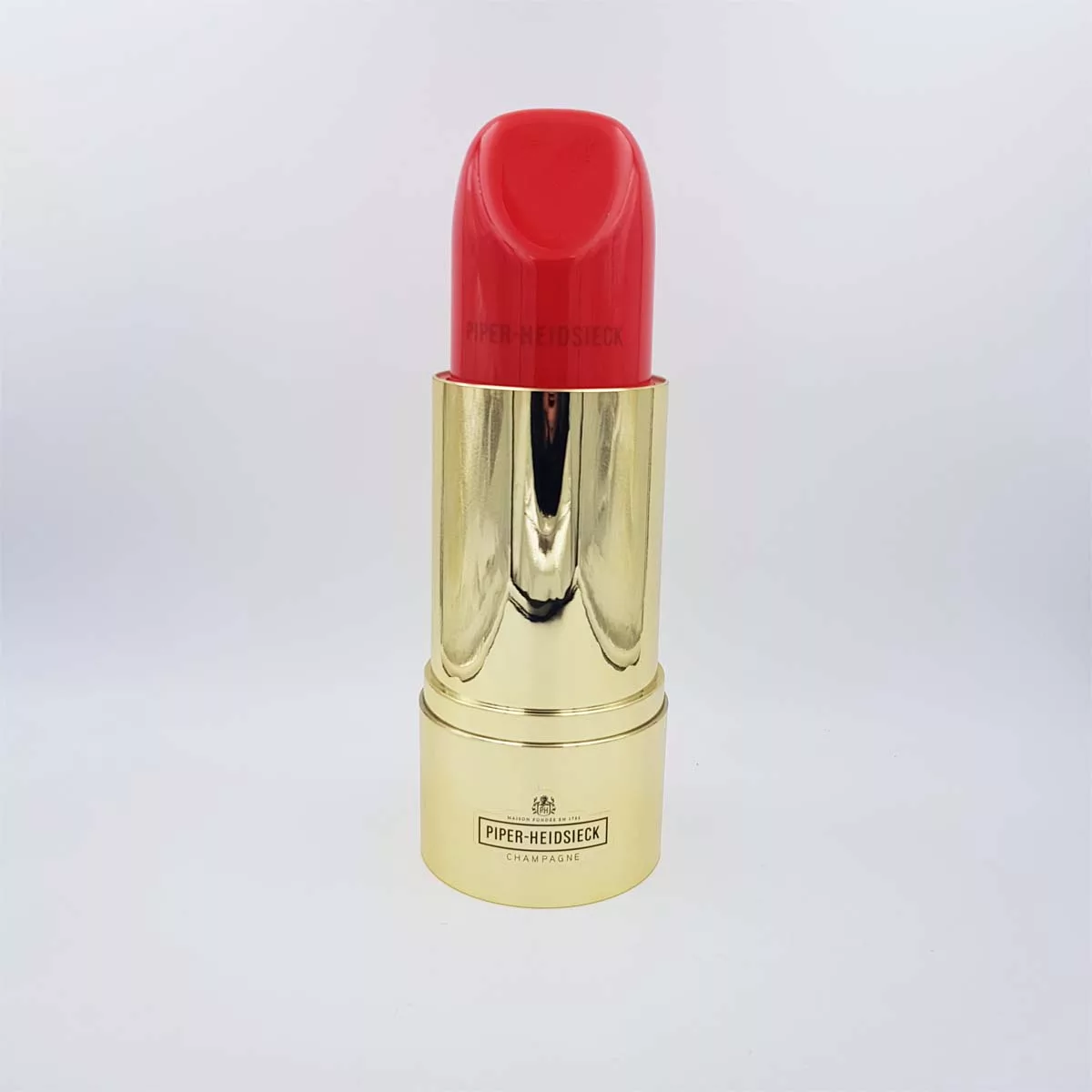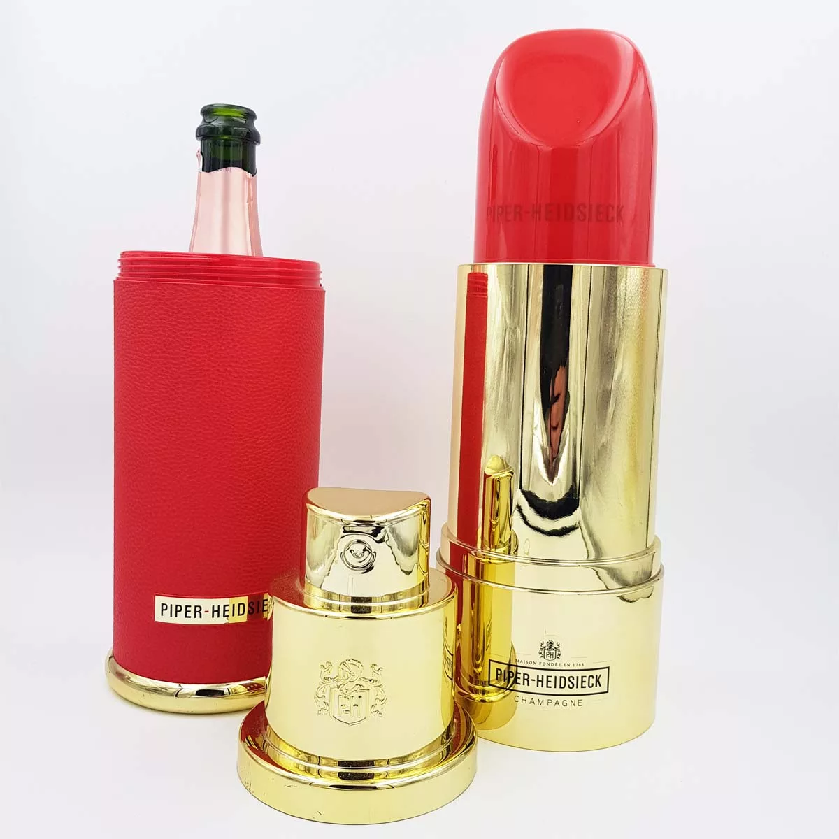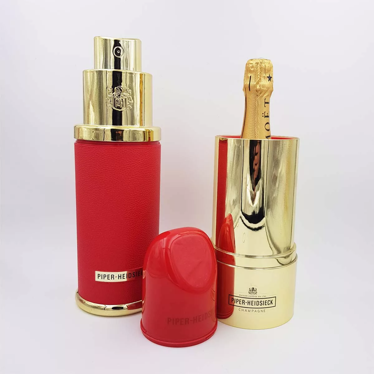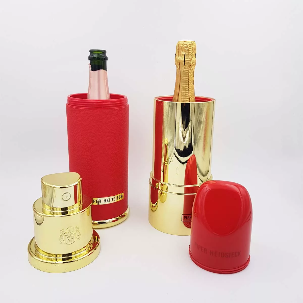 2 very original champagne coolers by prestigious brand Piper Heidsieck. In the shapes of giant lipstick and perfume spray. Just insert your champagne bottles and plunge into ice. Red and golden metal with plastic inside them for a better cooling.
