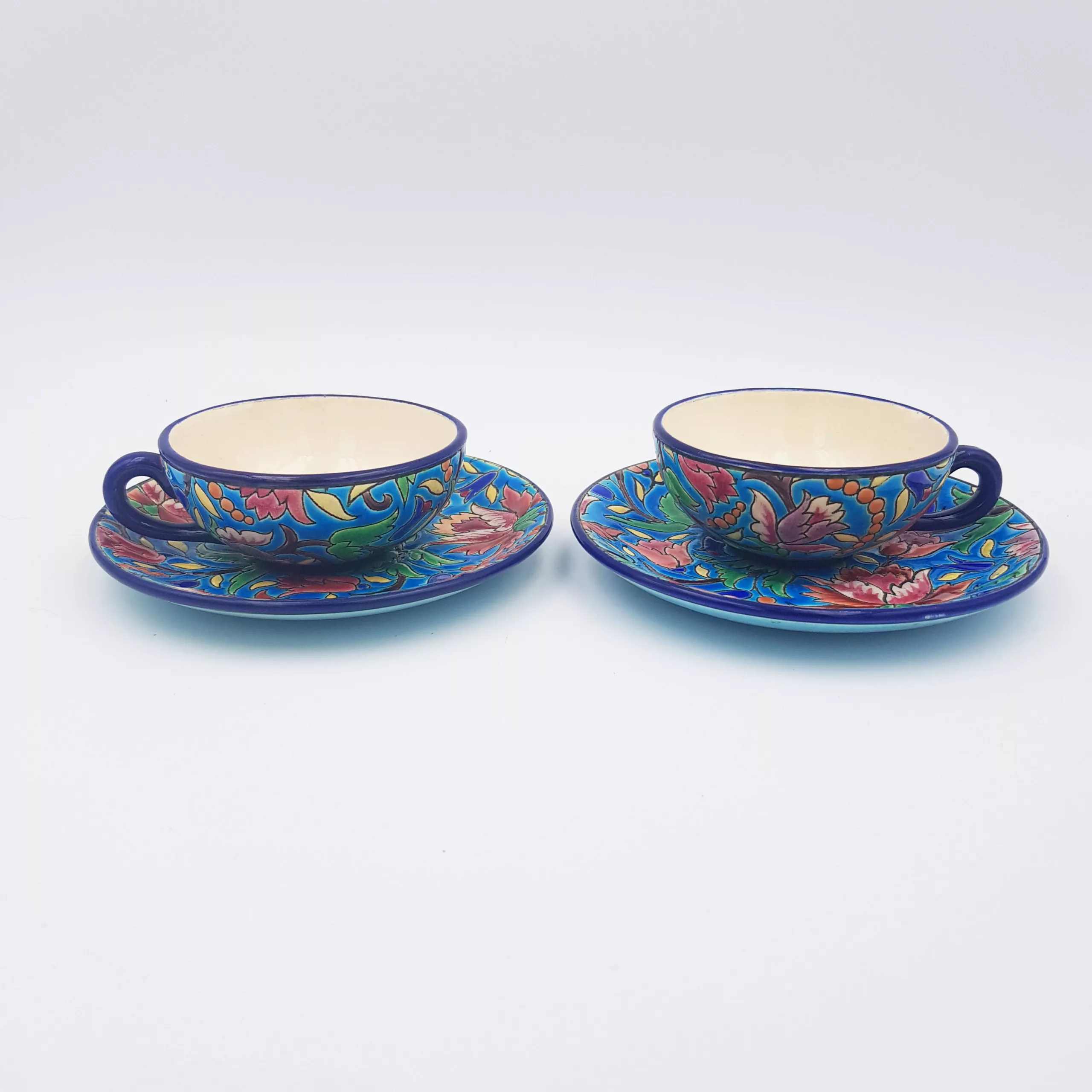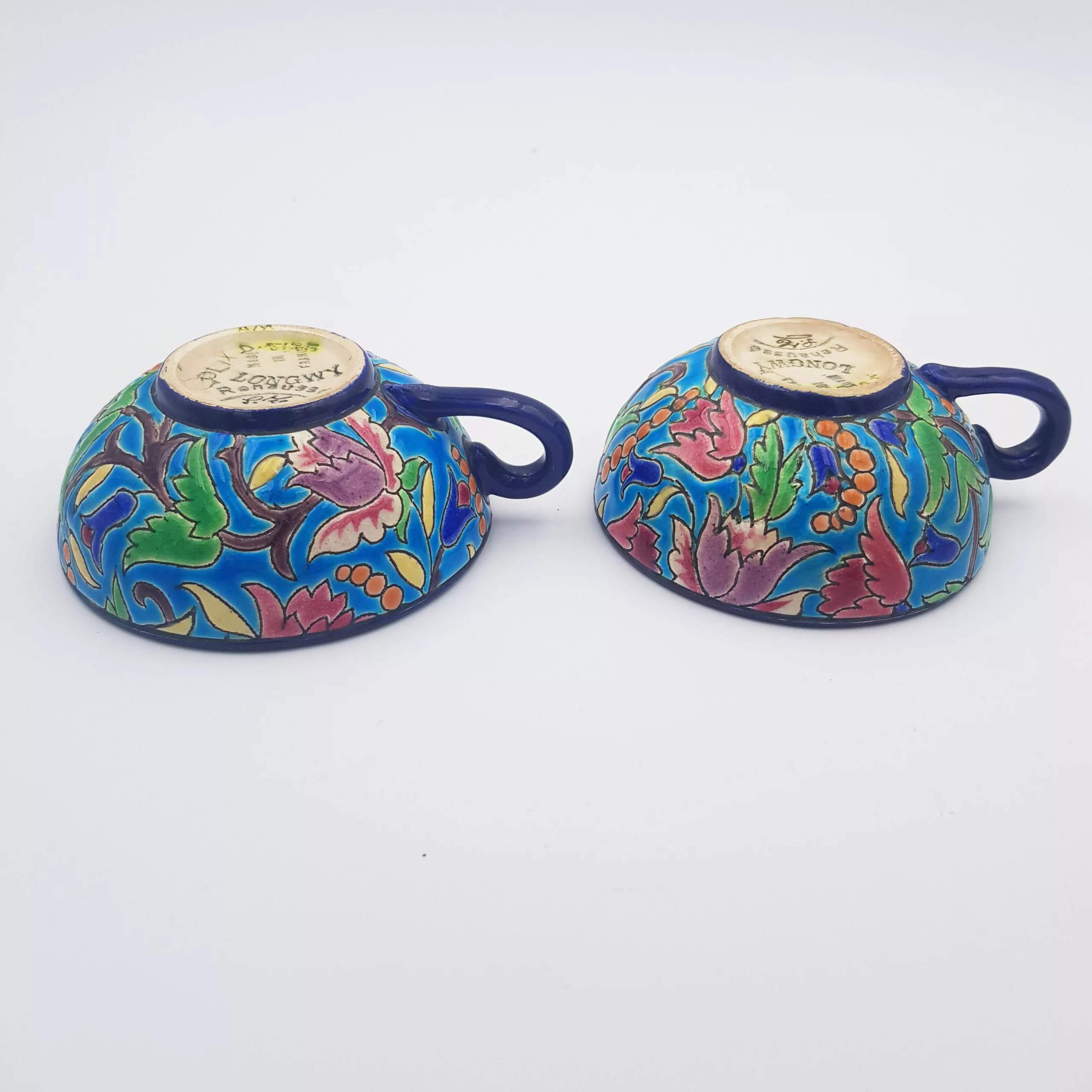 Antique small coffee cups from famous french manufacture of Longwy, known for their colorful naturalistic decors in cloisonne enamels. Capacity is 2 US fl oz, so that’s quite small, for coffees like espresso or ristretto. Come with their matching saucers and a rectangular serving dish with handles. The tray can be used either for serving the cups or as a cake dish.