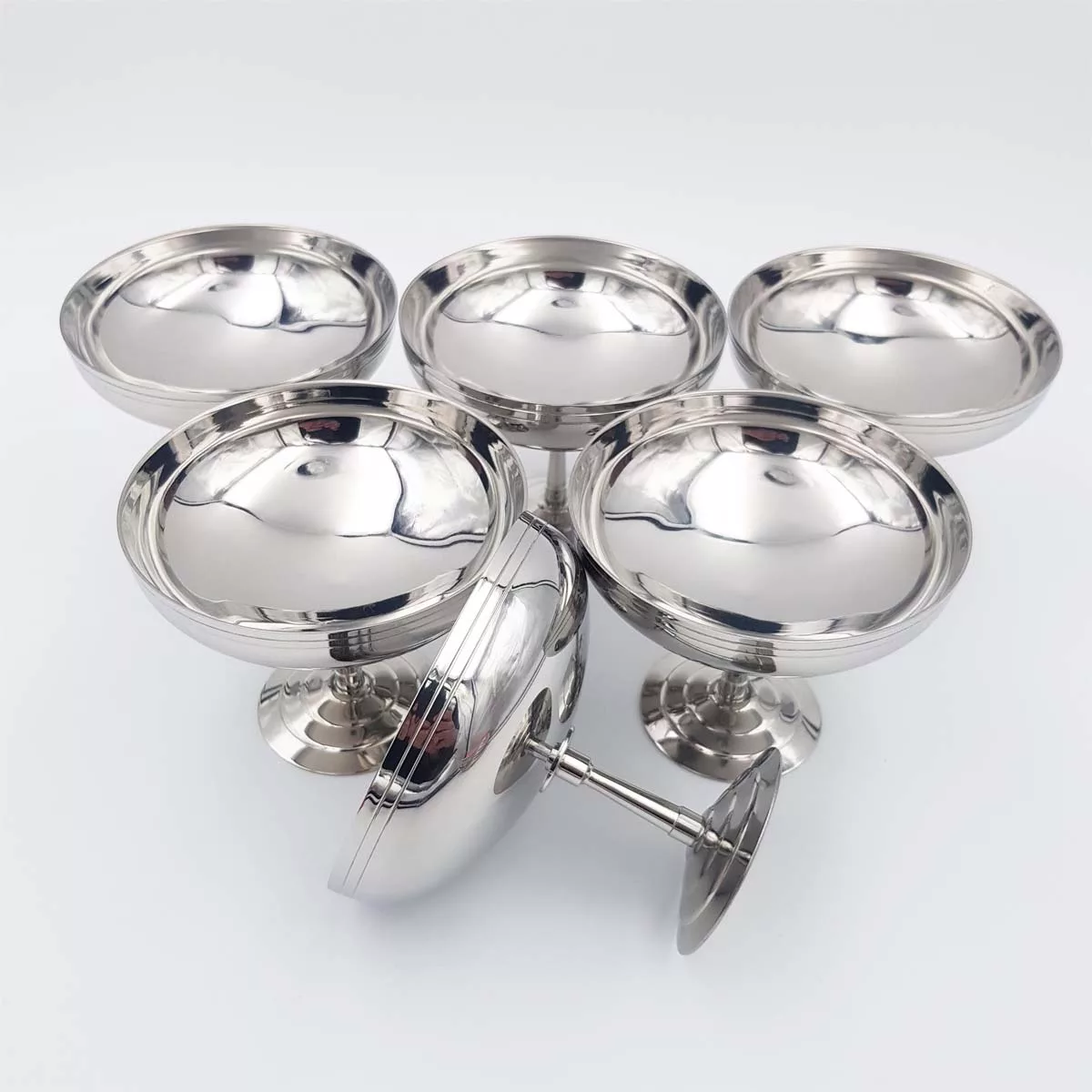 Set of 6 stainless steel sherbet cups or ice cream cups (there is room for 2 to 3 scoops). They will also be suitable for fruit salad or chocolate mousse portions. Could even be used as champagne cups (capacity 12cl / 4 US fl oz, that’s around 3/4th of a standard champagne cup / flute).