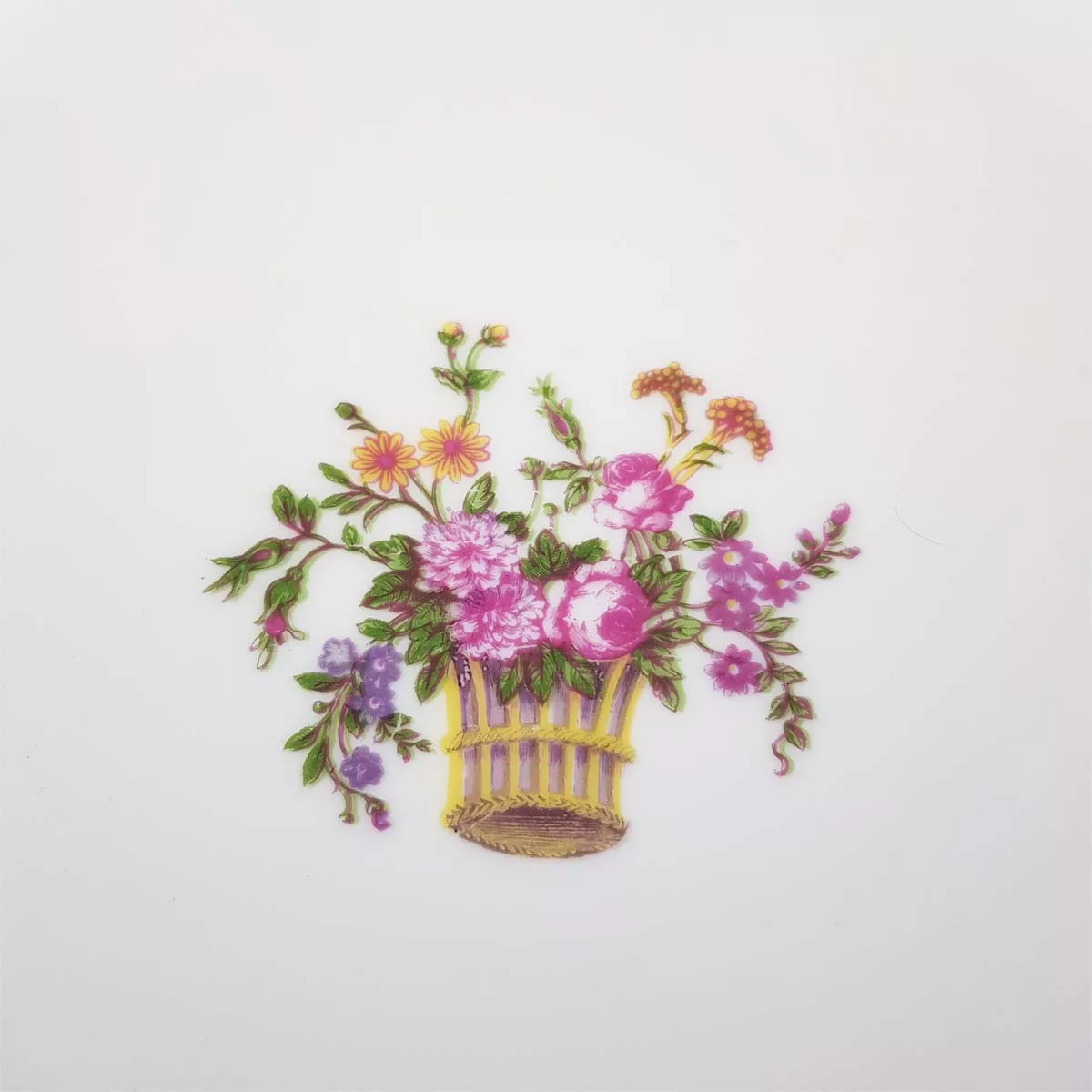 Decoration of enameled flowers and foliages. Burgundy borders on the top and the foot.