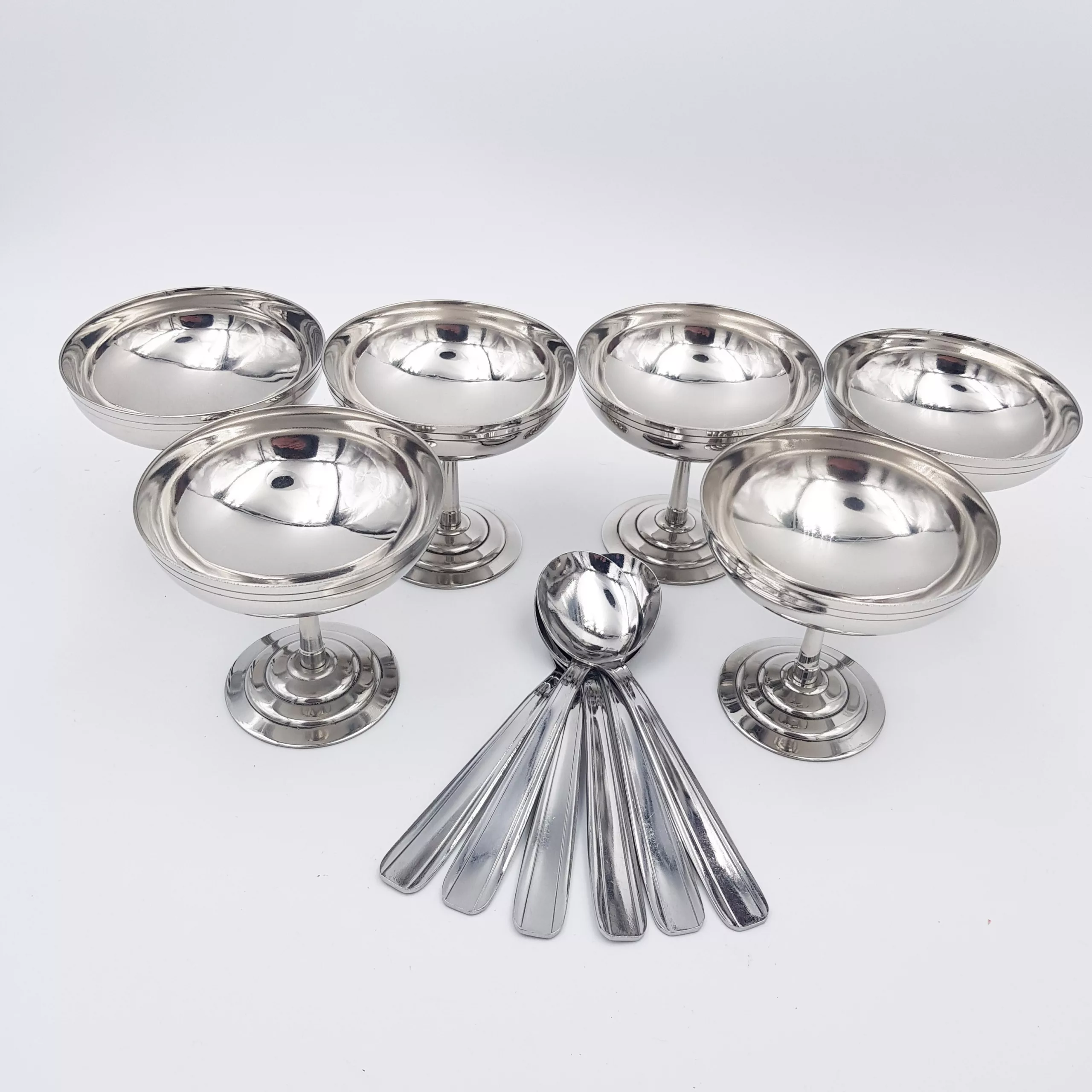 Set of 6 stainless dessert bowls, sherbet cups or ice cream cups (there is room for 1 scoop). They will also be suitable for small fruit salad or chocolate mousse portions. Could even be used as small champagne cups (capacity 6cl, that’s around half of a standard champagne cup / flute).