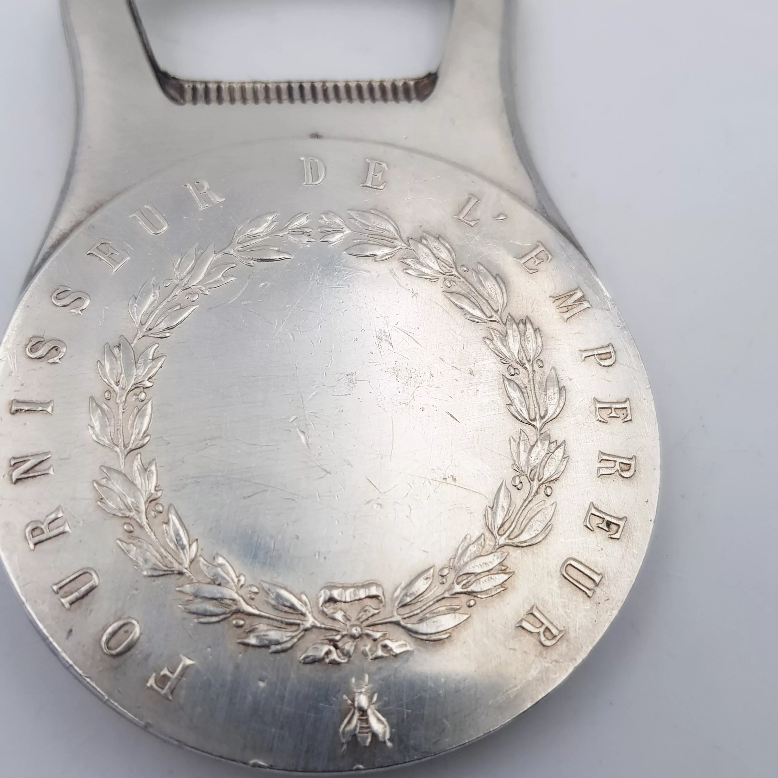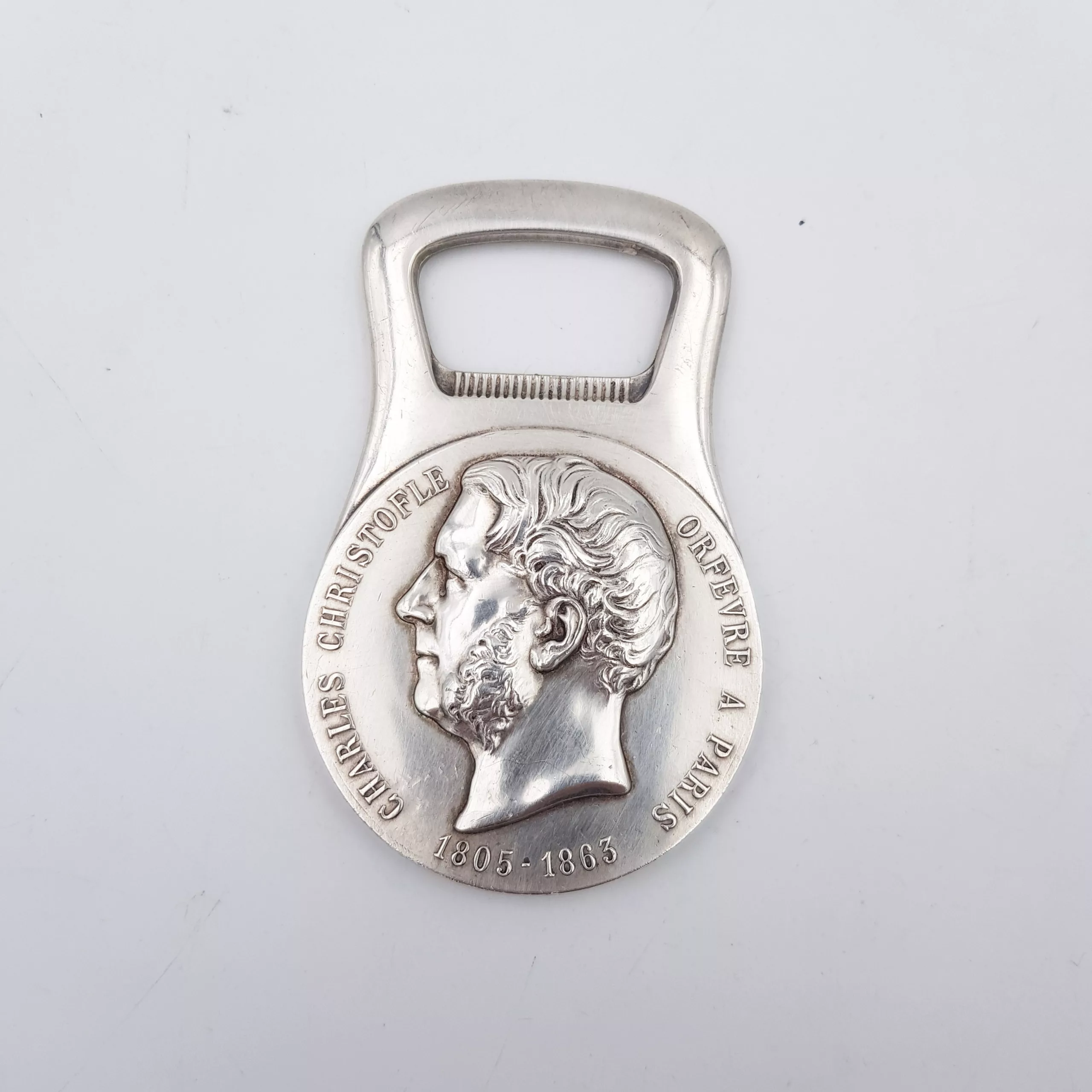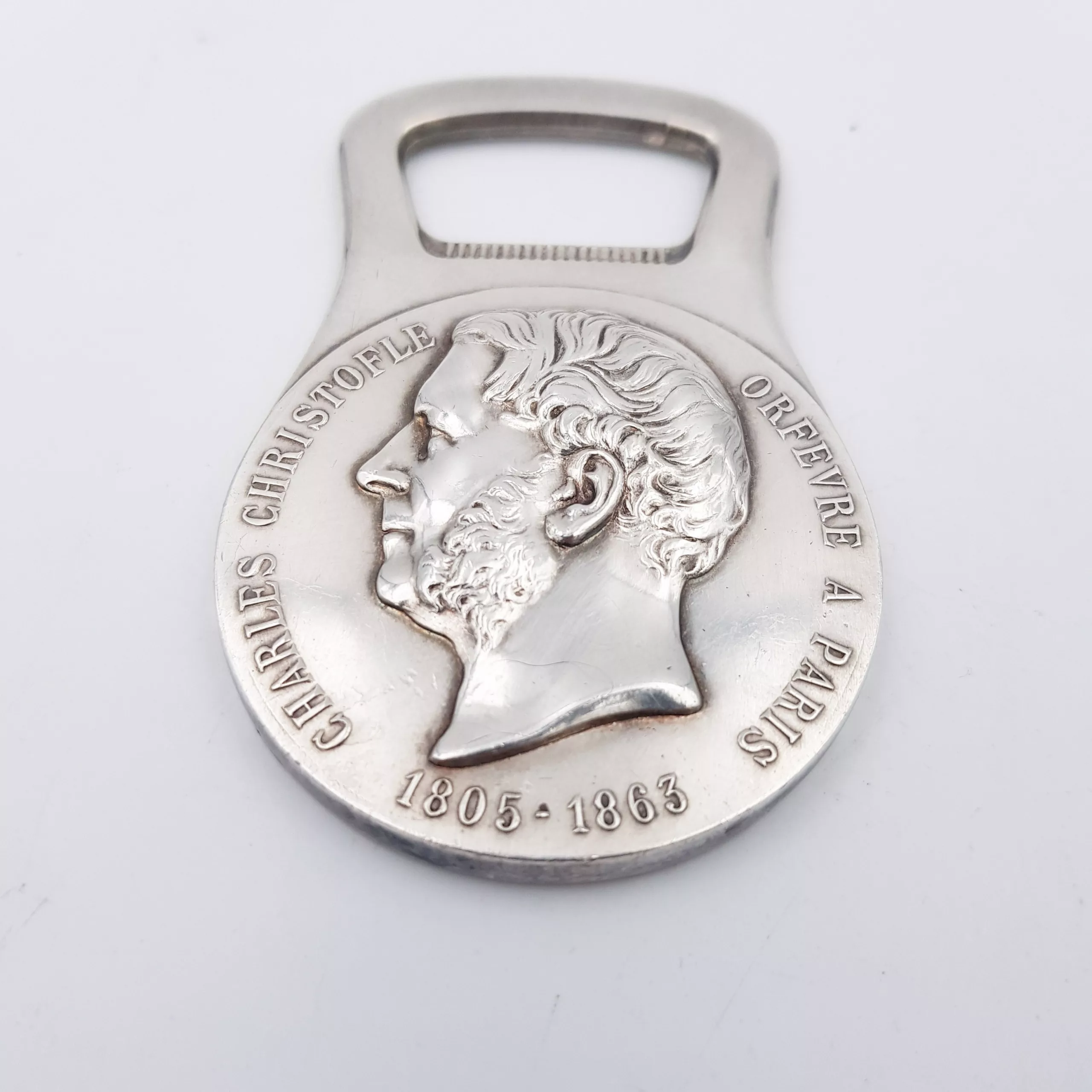 Christofle silver plated bottle opener with an embossed portrait of famous french silversmith Charles CHRISTOFLE, with its dates of birth and death (1805-1863), and the mention “ORFEVRE A PARIS” (“Silversmith, Paris”). On the back, two laurel crowns and the imperial bee + mention “Fournisseur de l’Empereur” (“Provider of the Emperor”, the Emperor being NAPOLEON III)