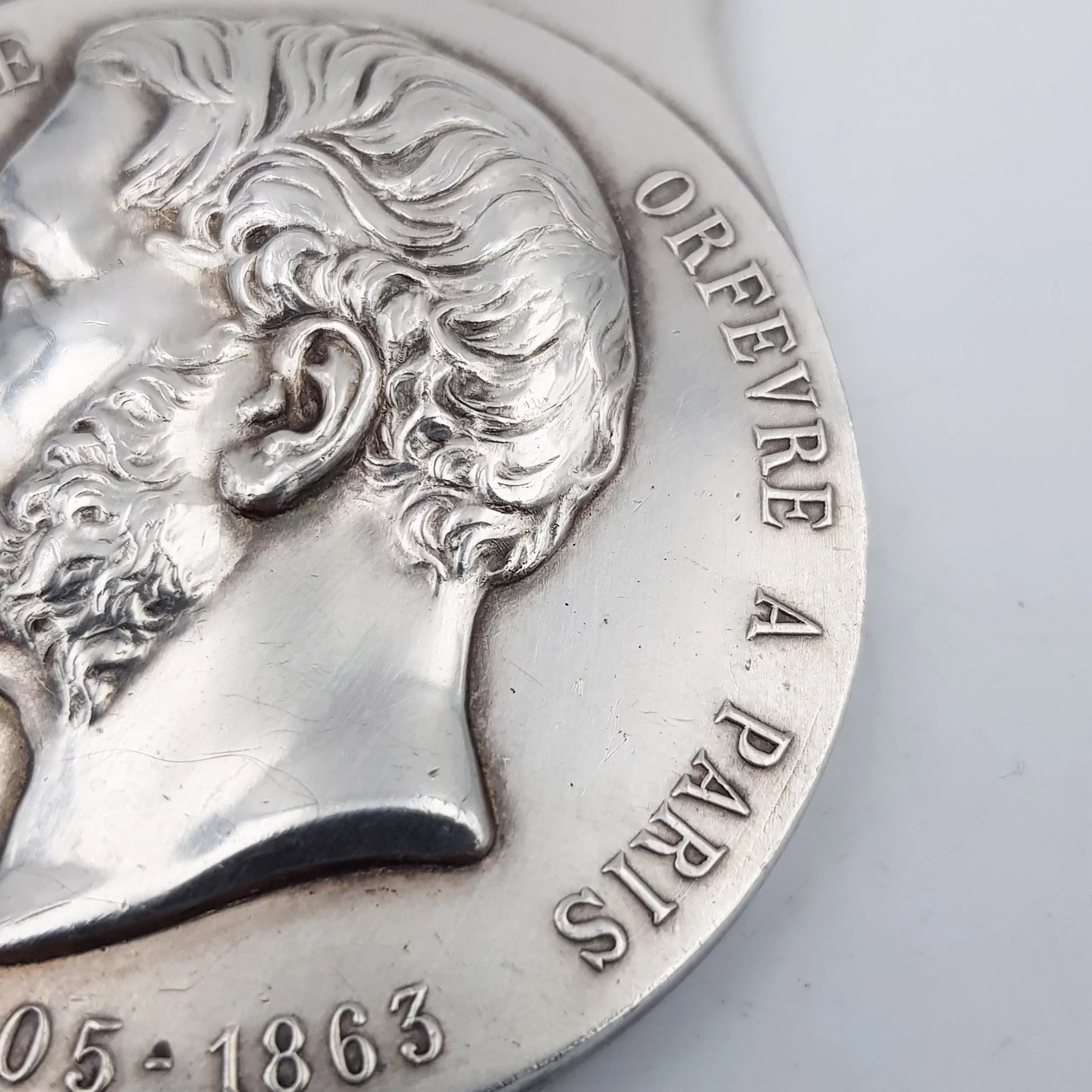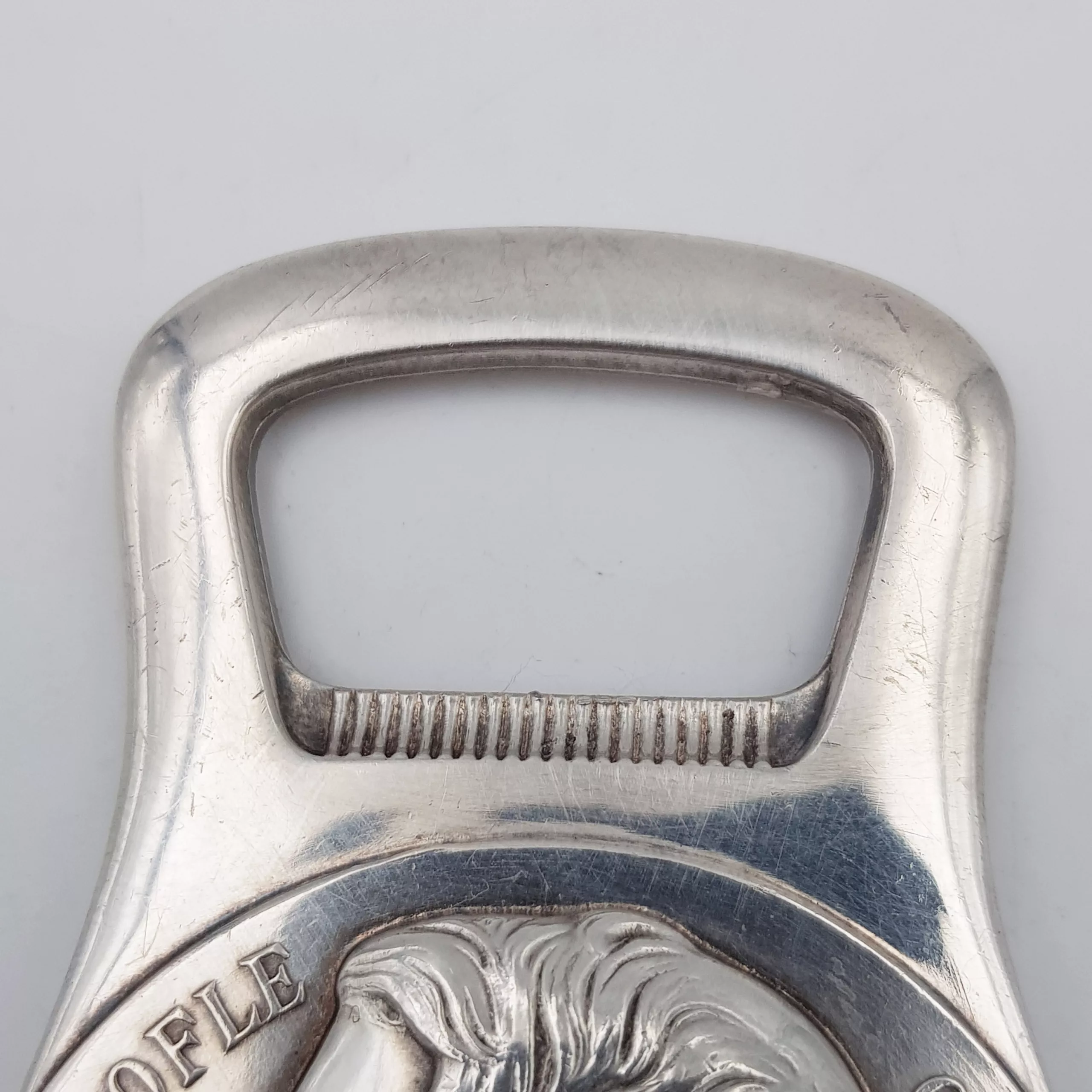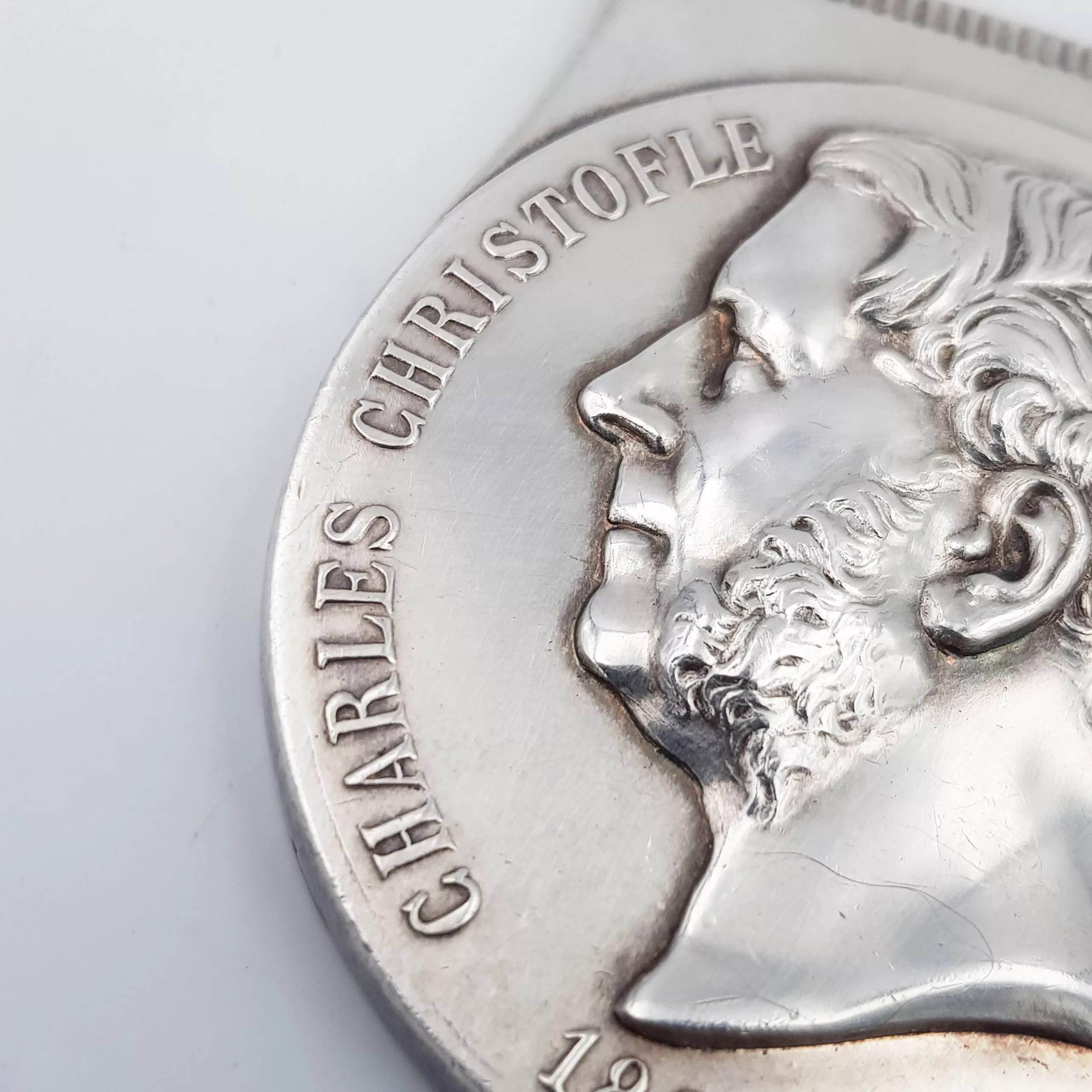 Christofle silver plated bottle opener with an embossed portrait of famous french silversmith Charles CHRISTOFLE, with its dates of birth and death (1805-1863), and the mention “ORFEVRE A PARIS” (“Silversmith, Paris”). On the back, two laurel crowns and the imperial bee + mention “Fournisseur de l’Empereur” (“Provider of the Emperor”, the Emperor being NAPOLEON III)