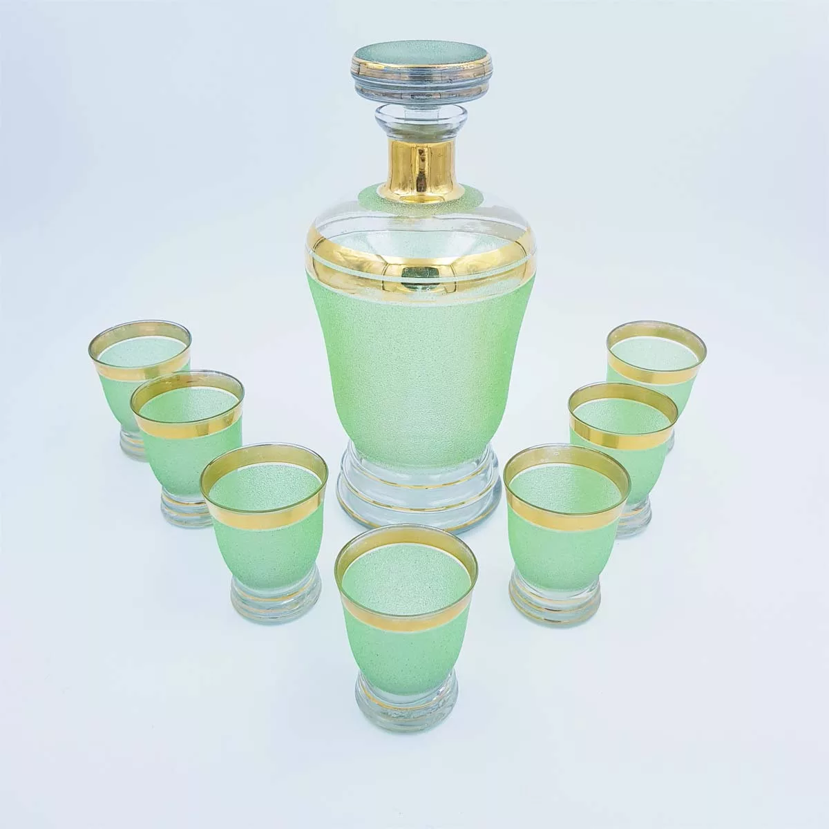 Very elegant alcohol set / liquor set made of seven glasses and one bottle with its stopper, for a vintage aperitif that will amaze your guests !