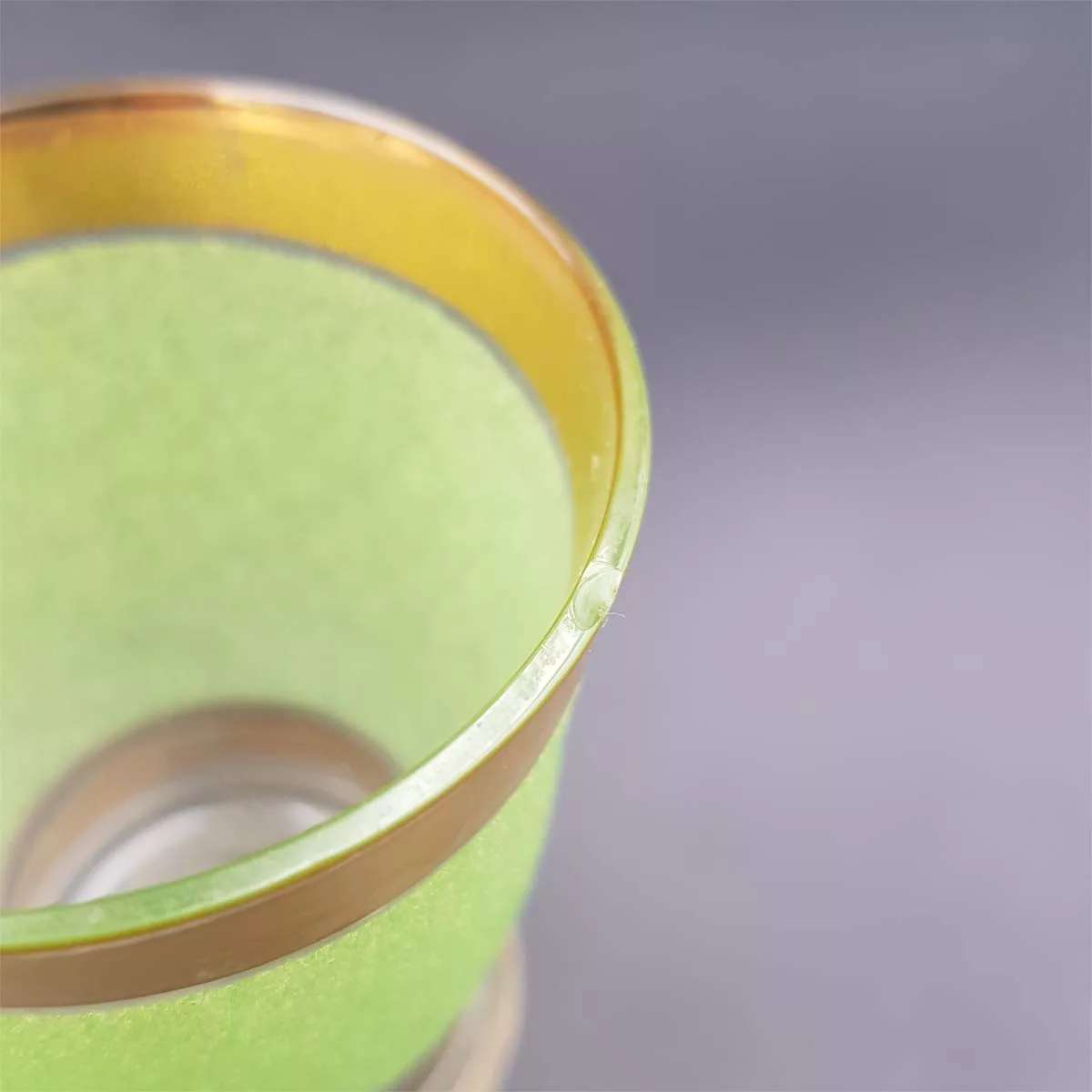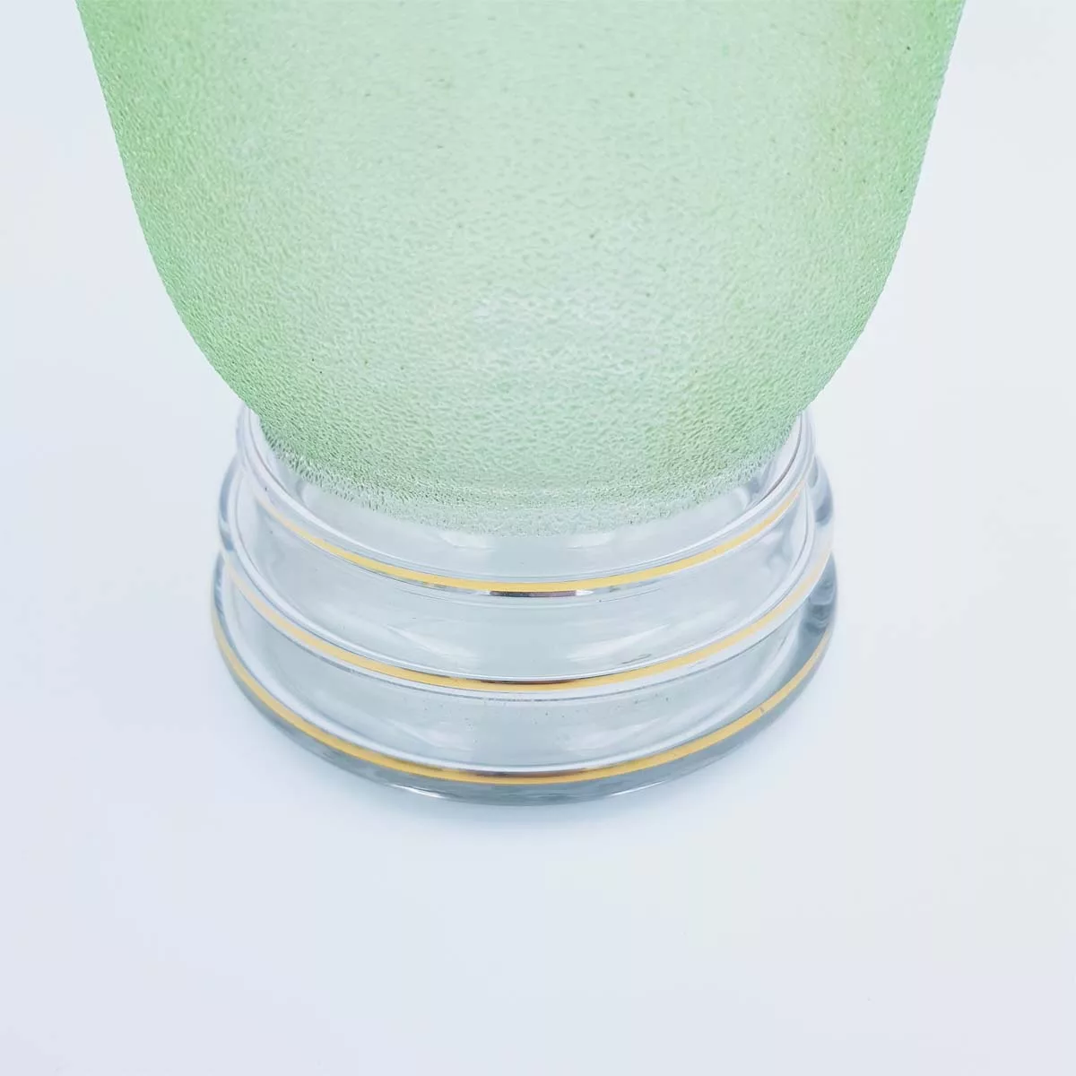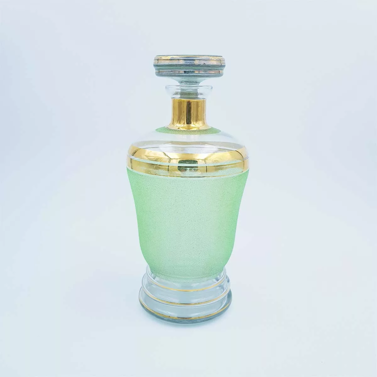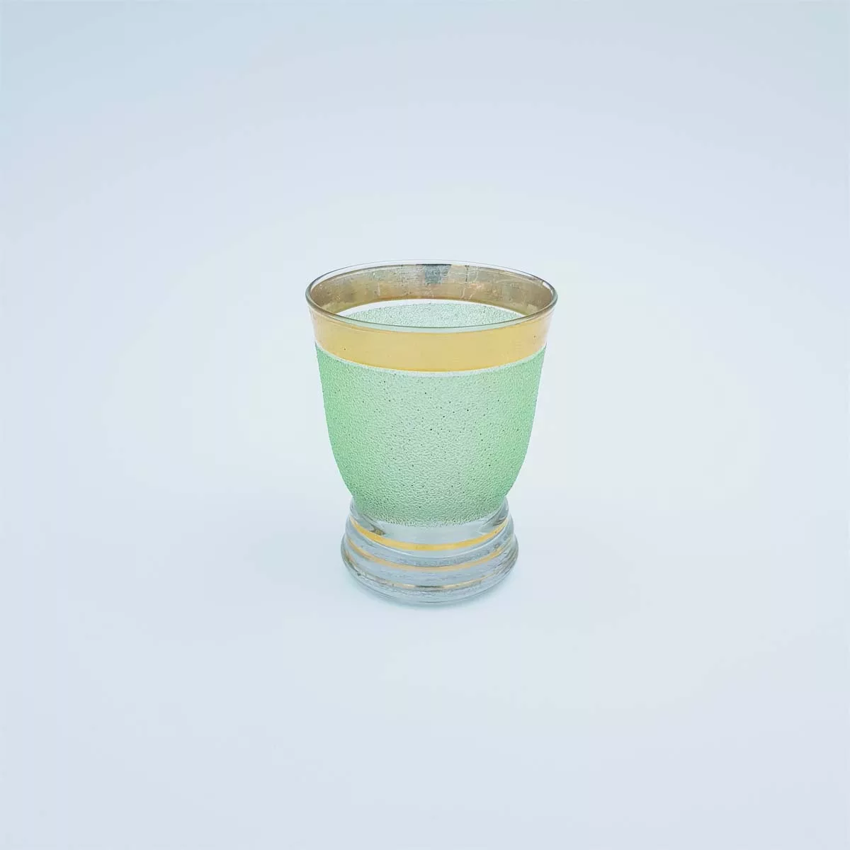Made of a grainy-textured and slightly opaque glass, its green tones and golden-coloured borders will give a new taste to your Scotch, cognac or vodka.