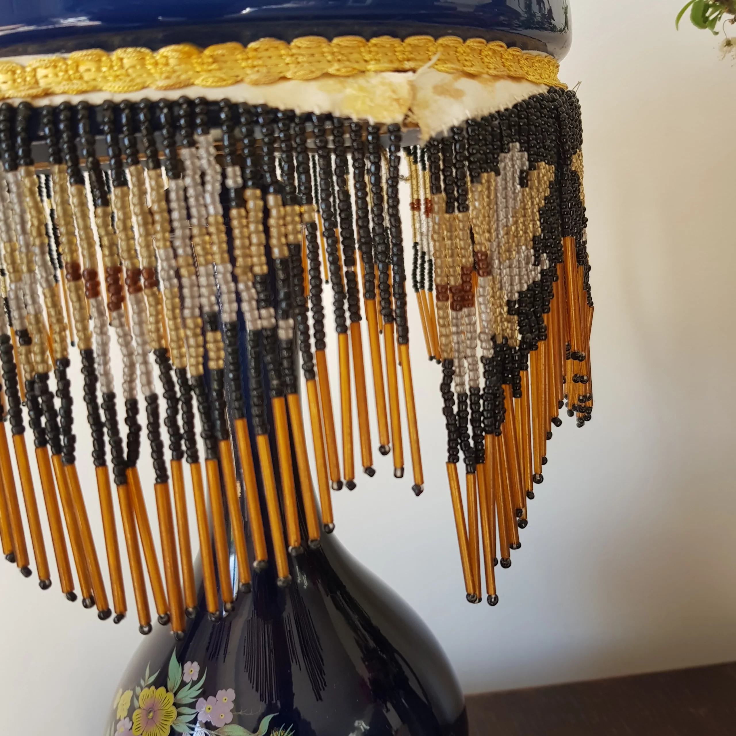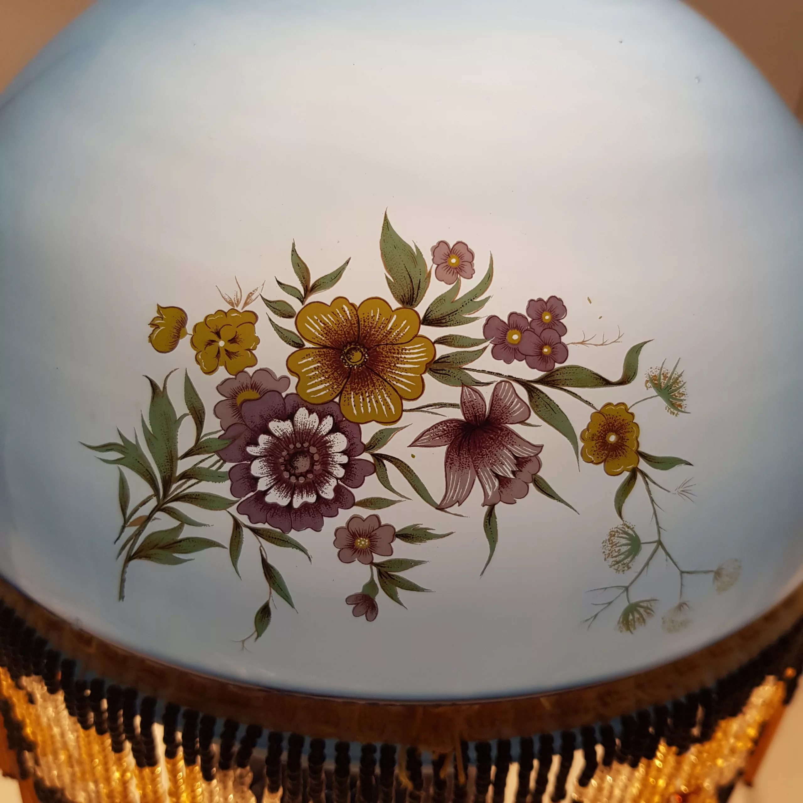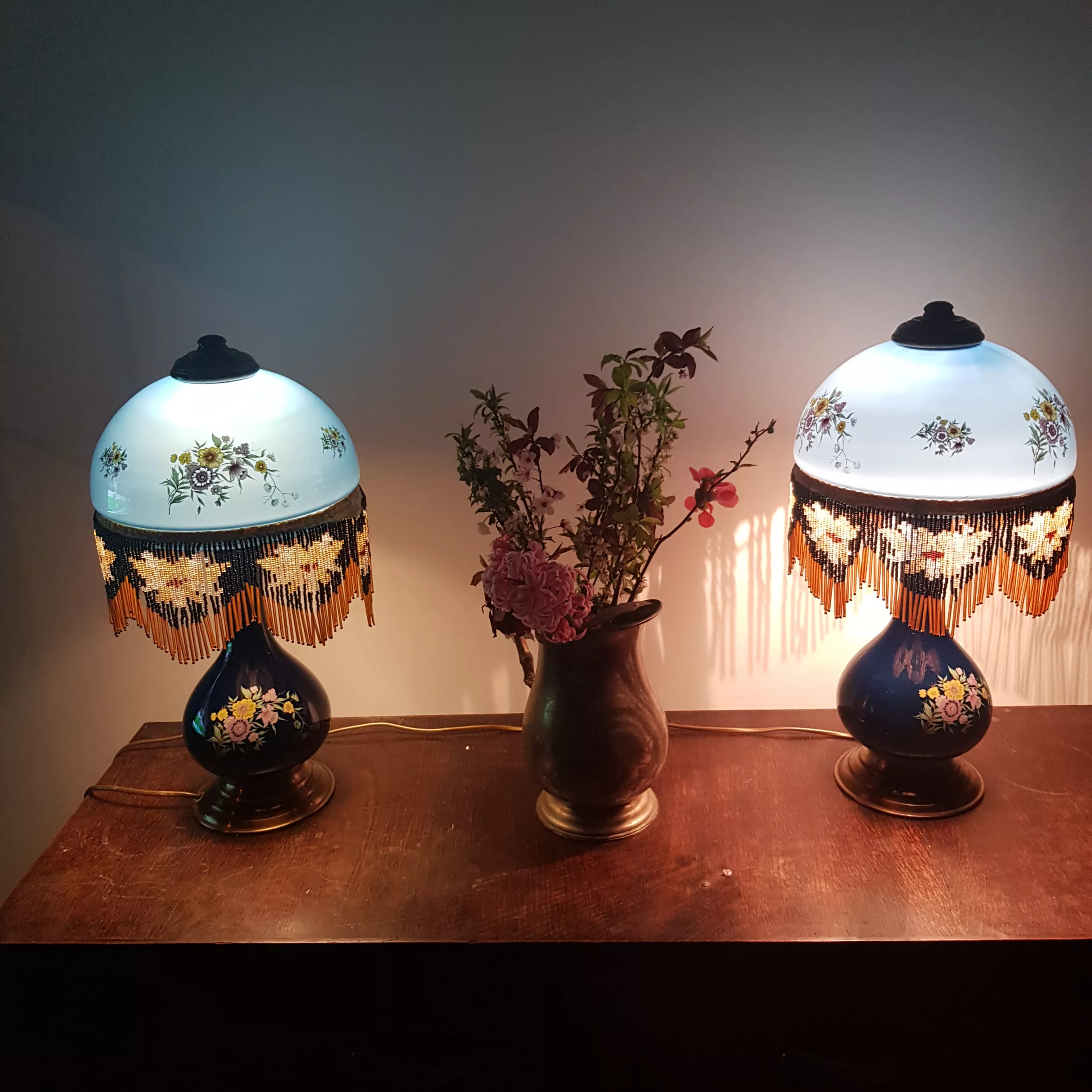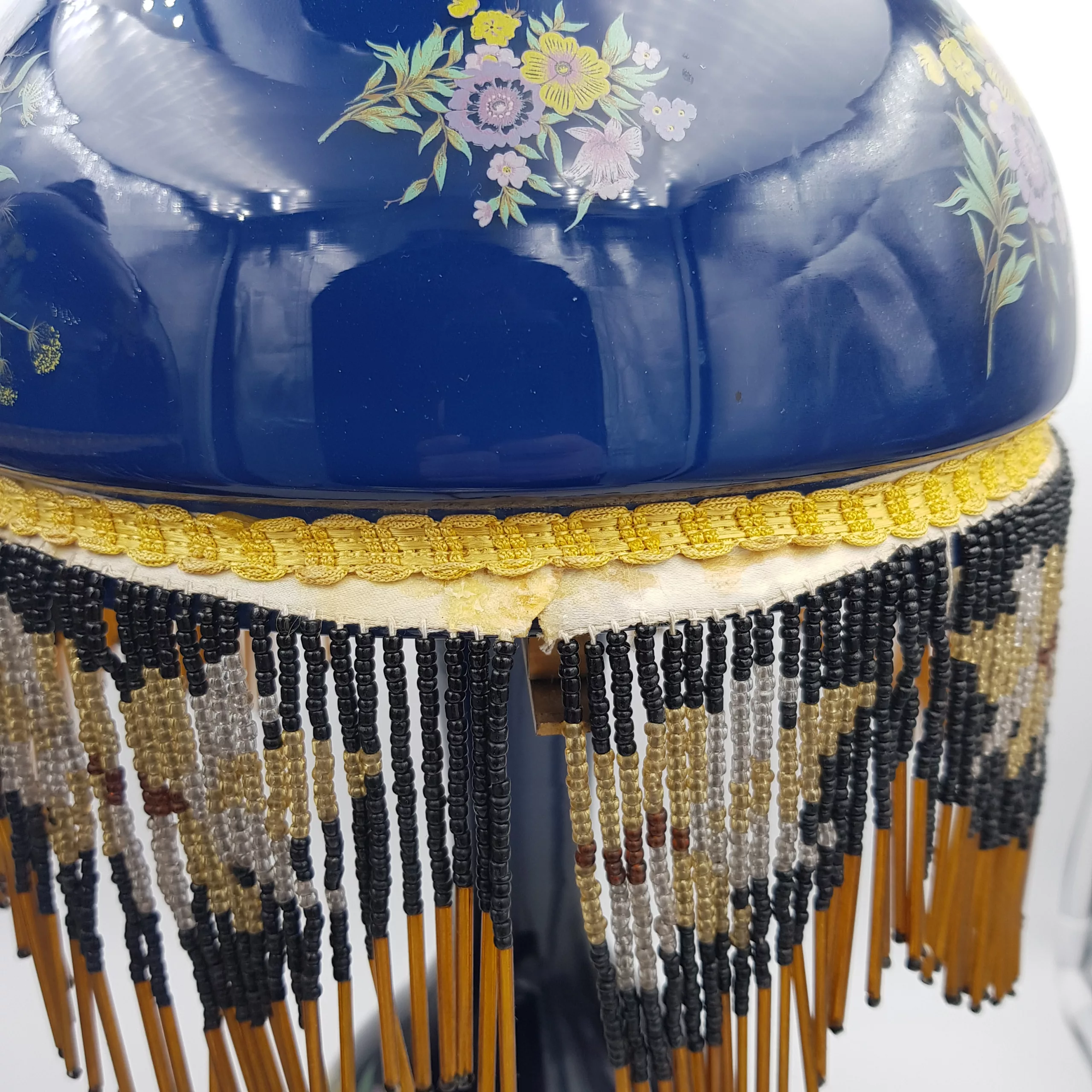 Splendid pair of antique lamps with dark blue glass domes as lampshades. Fancy polychrome floral decoration with a dominance of yellow, green and purple/pink tones. Fringes of black and orange brown pearls all around the lampshades forming geometrical patterns of what could be butterflies.