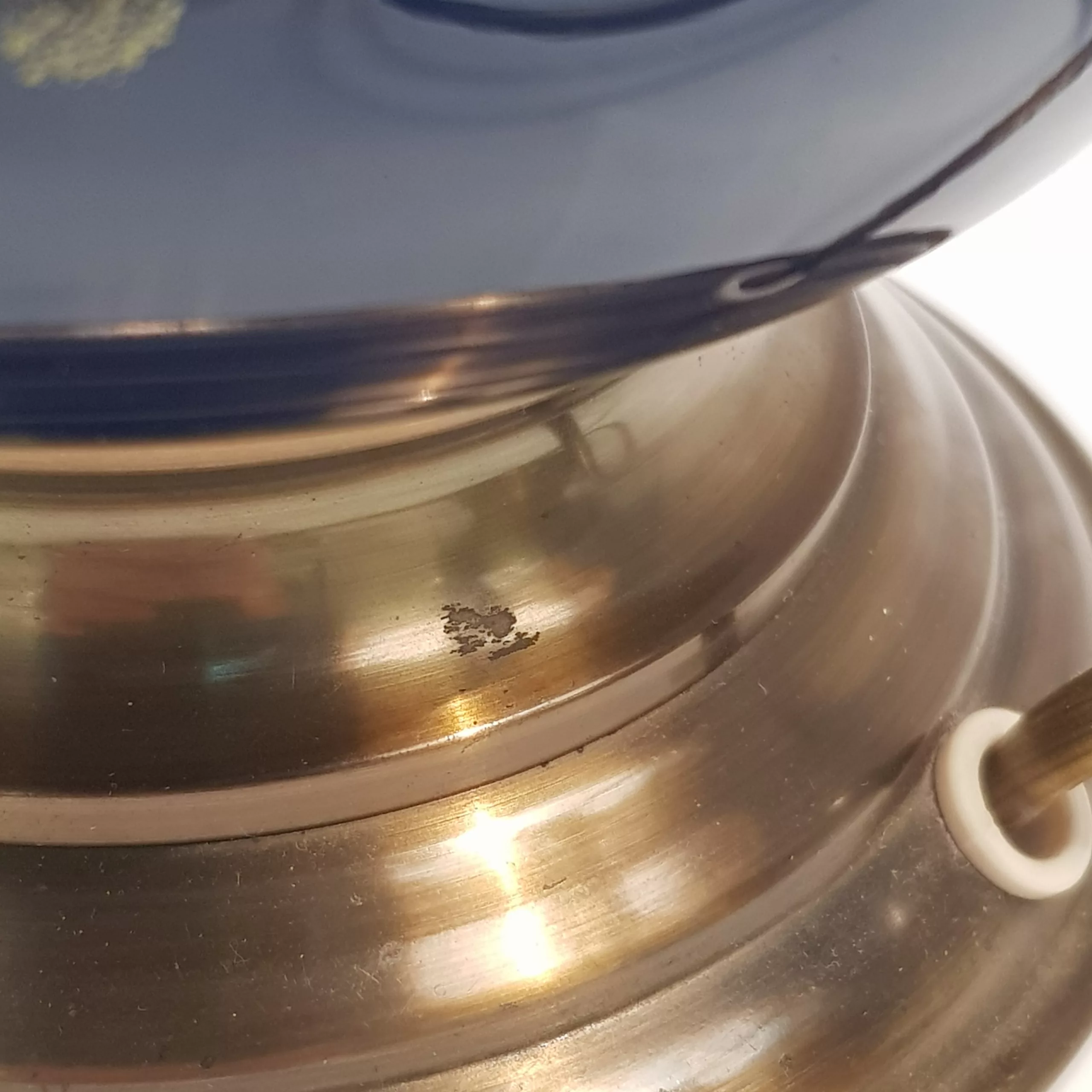Vintage product that has already been used. Limited scuffs from use. No chip or crack to the glass. On one lamp, the fabric holding the fringes all together has slipped from under the golden embroidery that is supposed to hide it, creating a misalignement between the pearls on one side of the lamp. Few signs of ageing to the brass. Please see the video and the pictures.