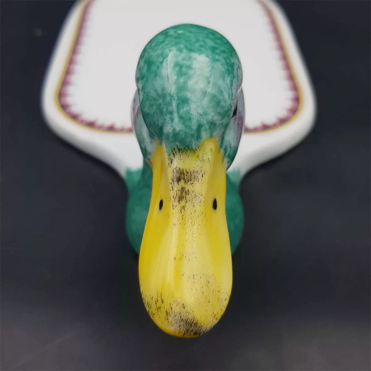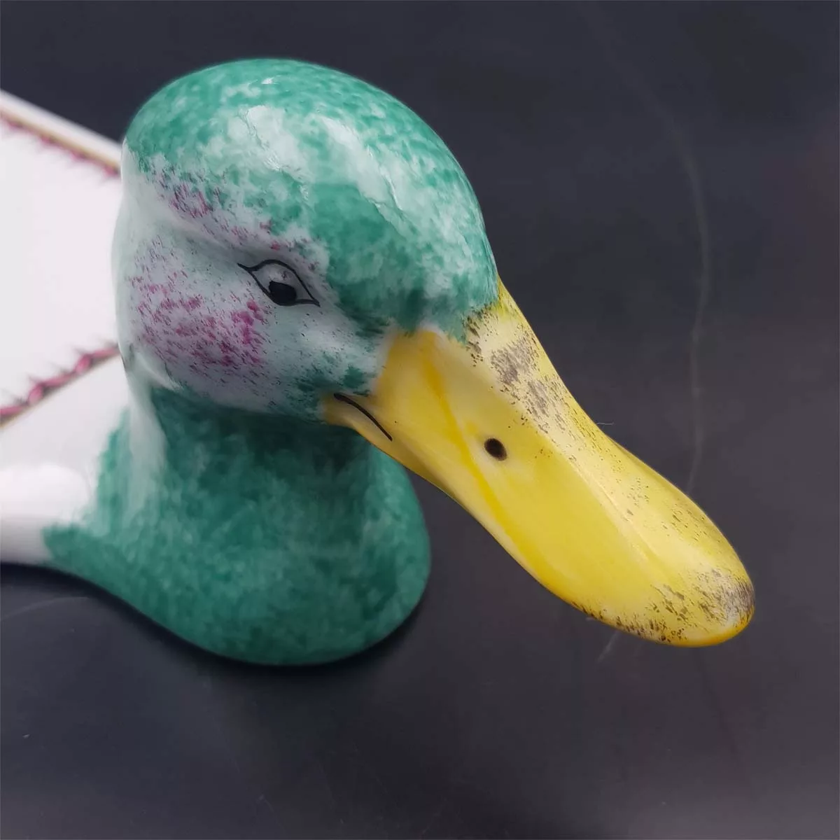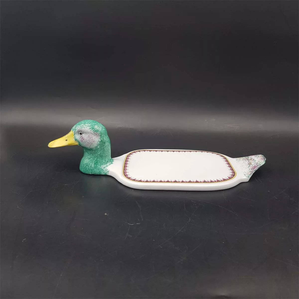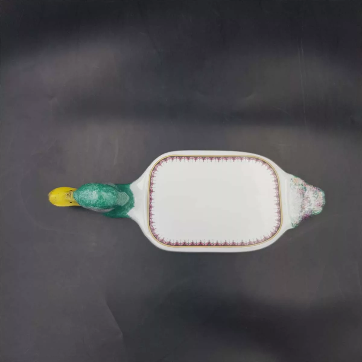 In the shape of a duck, with its head and tail in green, yellow and purple tones. Central area for serving the foie gras is white with a border decoration of stylized garlands in pink and gilt tones.