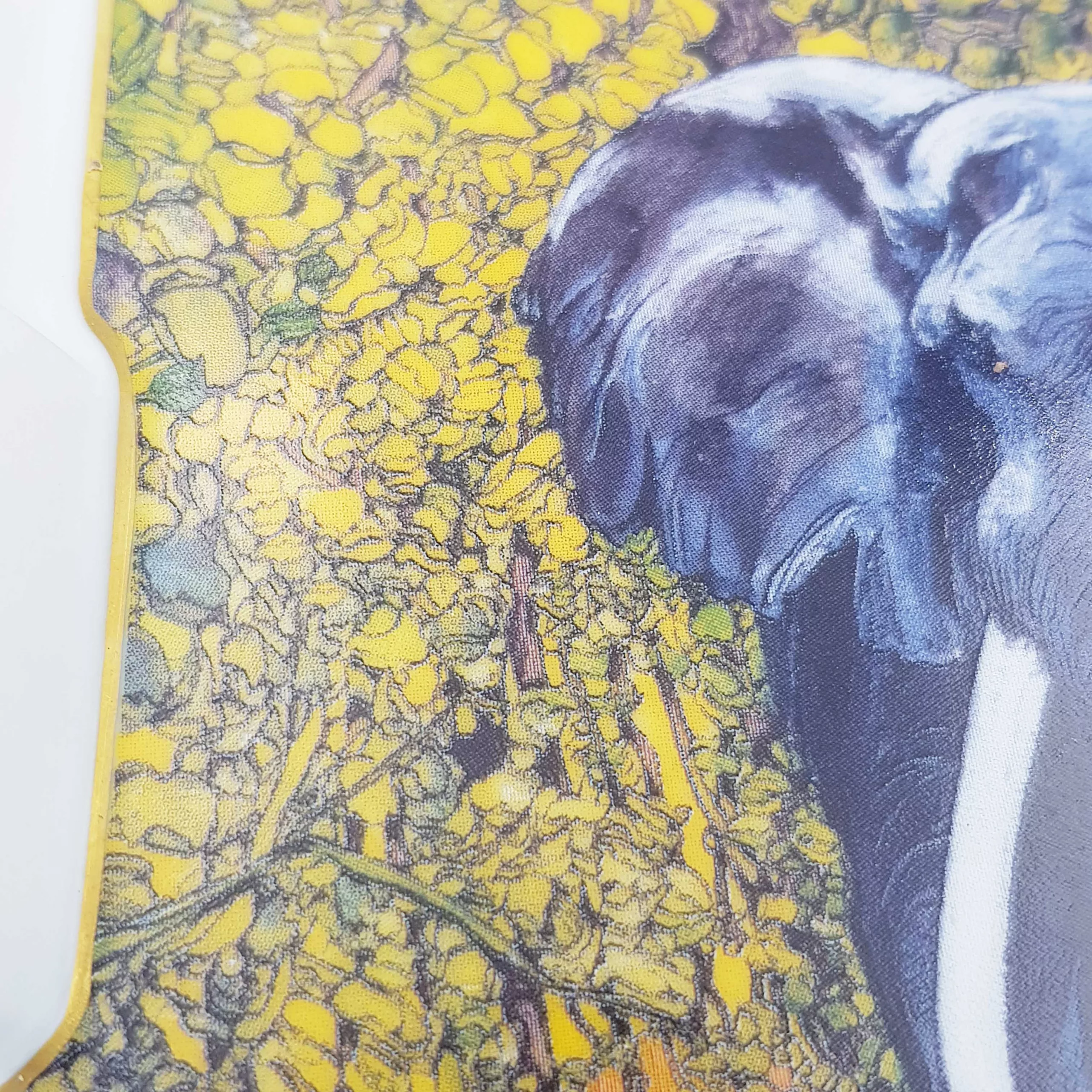 Decoration of the front view of an elephant in a stylized jungle environment. Various shades of green (olive, apple, emerald tones) and yellow/orange (ochre, soffran tones). Gilt border around the ashtray and the cigar holders.