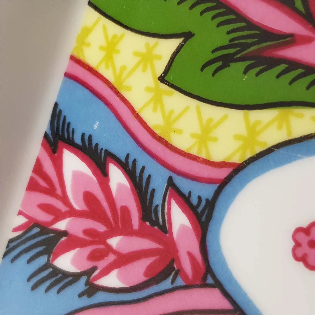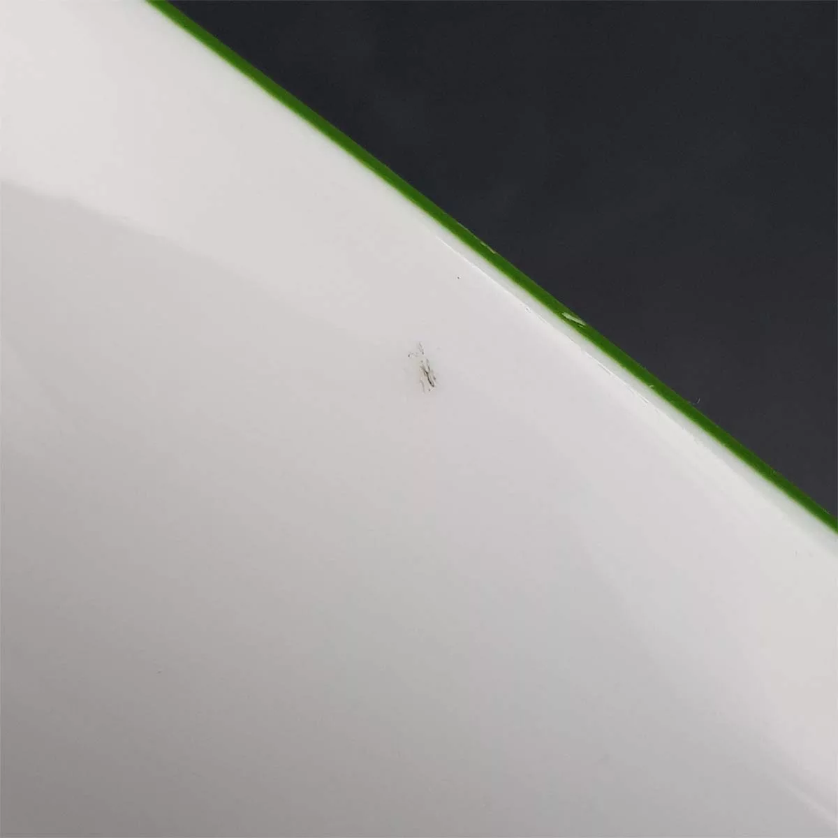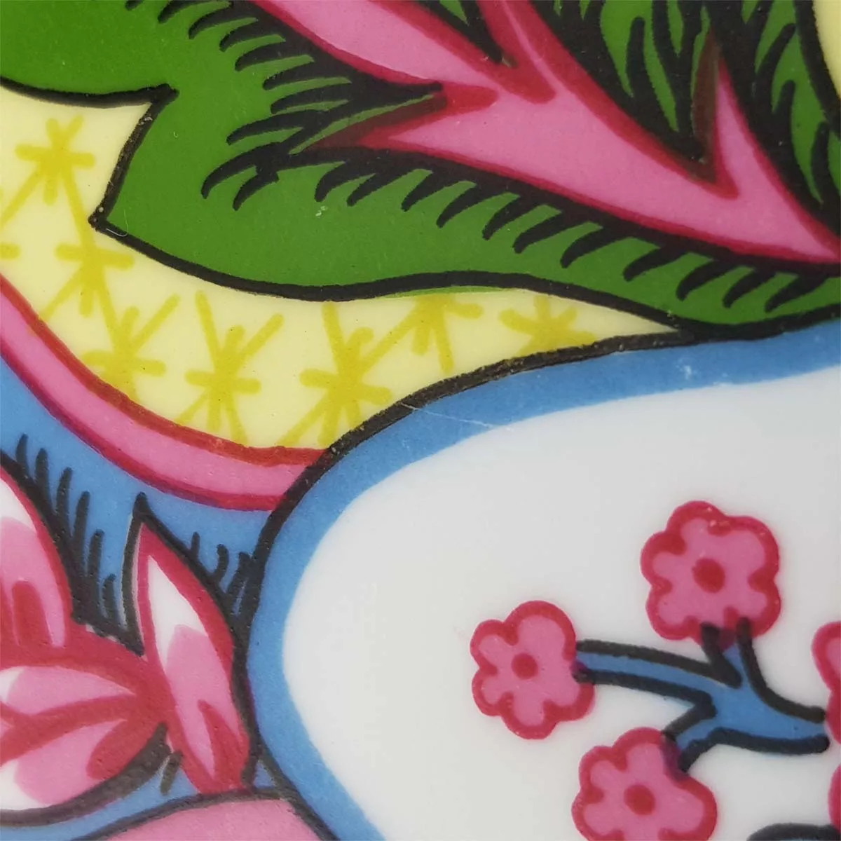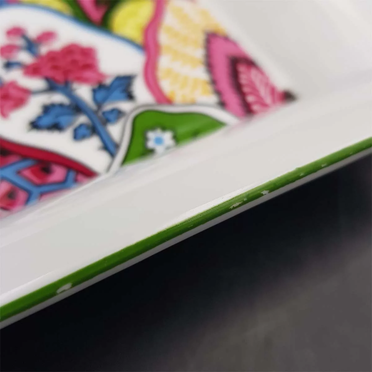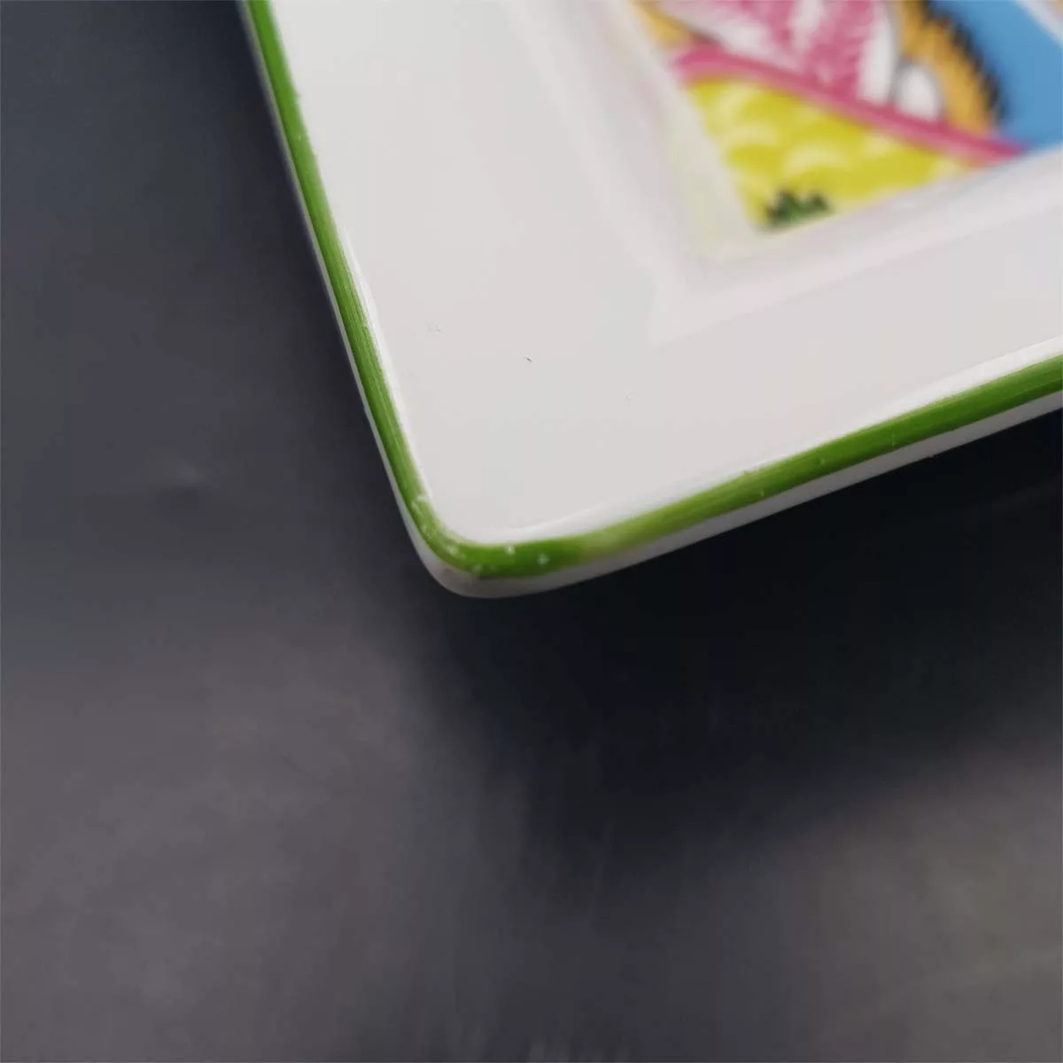 In very good condition, no chip or crack whatsoever. Colors still very bright. A few very limited scratches to the central decoration, barely visible. A tiny pitting to the white enamel on a side. A bit more lacks of enamel on the green border around the ashtray. Please see pictures.